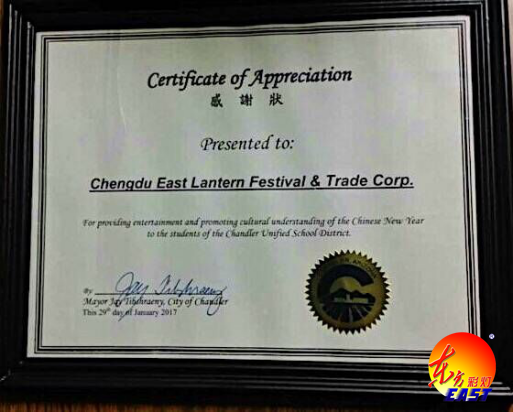 自貢燈貿(mào)集團(tuán)股份有限公司、四川藝思特彩燈文化傳播有限公司主辦的“2016世界之光——彩燈嘉年華”跨年燈展,于當(dāng)?shù)貢r(shí)間2017年1月29日在美國(guó)亞利桑那州首府菲尼克斯(鳳凰城)順利落下帷幕。成都市委副秘書(shū)長(zhǎng)、印第安納州州長(zhǎng) Burns Mike及當(dāng)?shù)卣獑T出席閉幕式并代表州政府對(duì)本次燈展頒發(fā)特令嘉獎(jiǎng)。