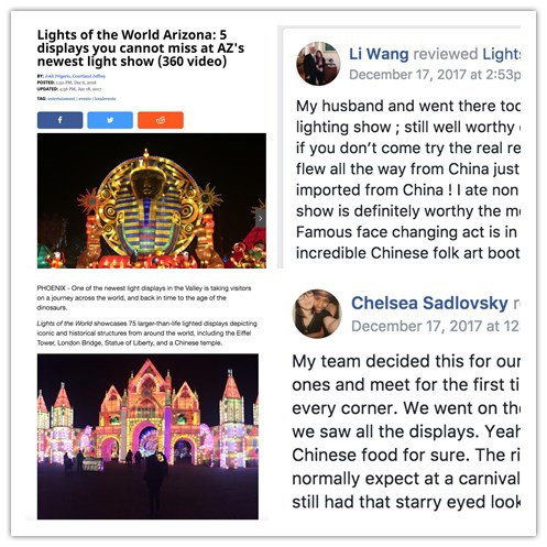 本次燈展是東方彩燈繼2016第一次成功舉辦美國(guó)菲尼克斯彩燈嘉年華的再次完美呈現(xiàn)。2017美國(guó)菲尼克斯彩燈嘉年華,自開(kāi)展以來(lái)備受美國(guó)當(dāng)?shù)孛癖姛崤鹾透鞔笾髁髅襟w關(guān)注、在facebook等社交平臺(tái)更是掀起了中國(guó)彩燈熱潮,菲尼克斯當(dāng)?shù)匦侣劇?Now @ 6 》報(bào)道稱(chēng)“2017世界之光彩燈嘉年華是北美最大的彩燈節(jié),是全球文化集合地,游客仿佛置身于迪士尼中。”