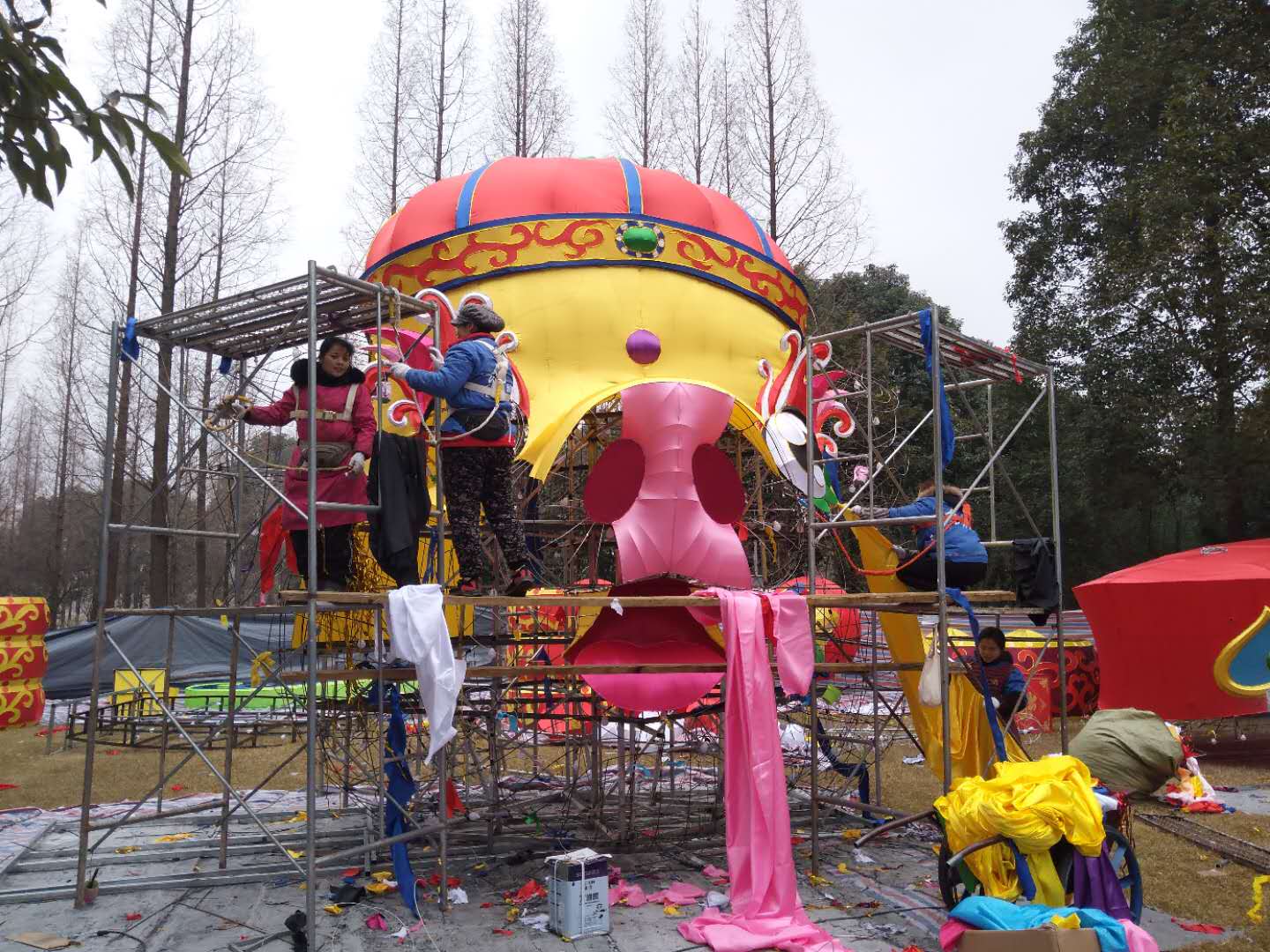 目前,東方彩燈身懷技藝的制燈匠人正緊鑼密鼓的制作中。那些看上去冰冷粗獷的鐵絲、綢緞,在他們“馴化”下變得溫順隨和,一組組或生動、或委婉、或雄渾的燈組栩栩如生。本屆“太陽節(jié)”較大的突破是所有燈組均采用節(jié)能環(huán)保燈具,較之往年減少三分之二的用電負荷,打造炫彩奪目的燈光效果的同時,保護了環(huán)境和游客。在制作方面,部分主要大型燈組均采用加密色丁布裝飾,傳統(tǒng)燈組結合現(xiàn)代科技,民俗風情融合時尚藝術,集現(xiàn)代感、藝術感為一體,凸顯顏色豐富的層次感。