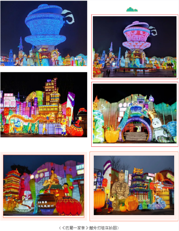 今年,自貢·中華彩燈大世界以“觀自貢燈 過中國年”為主題,550畝展區(qū)、十五大主題、上百組彩燈,給游客們帶來一場自貢彩燈文創(chuàng)新紀(jì)元的視覺盛宴。有800多年歷史的自貢燈會,開啟全新云時代,將自貢燈會打造成展現(xiàn)時代風(fēng)貌的大舞臺,讓您足不出戶也能領(lǐng)略“天下第一燈”的魅力!由燈貿(mào)集團(tuán)創(chuàng)意、設(shè)計團(tuán)隊等數(shù)百名彩燈匠人歷時兩個多月精心打造的《巴蜀一家親》、《自貢記憶》、《五糧液》三個大型燈組?!栋褪褚患矣H》薈萃川渝各城風(fēng)貌之靈光,主體以獨具特色的川渝茶文化代表——蓋碗茶為載體,現(xiàn)代透光材質(zhì)制作憨態(tài)可掬的熊貓,下方高鐵環(huán)繞而行,輔以巴蜀特色元素,將自貢傳統(tǒng)彩燈制作工藝與新技術(shù)相結(jié)合,為游客帶來可看、可聽、可聞的沉浸式的觀燈體驗。