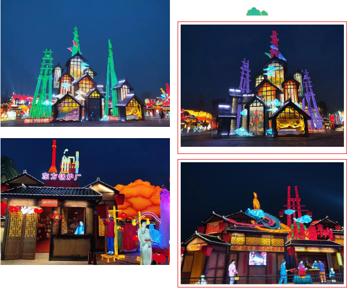 《自貢記憶》主燈組使用傳統(tǒng)材質(zhì)結(jié)合現(xiàn)代工藝,宏偉的天車獨創(chuàng)性的使用啤酒瓶制作,配合追光變色形成絢麗奪目的燈光效果。顯示屏剪影式表現(xiàn)自貢元素??铸埓┬?、錦鯉游動,還有靈活靈現(xiàn)的自貢歷史場景和人物,還原了一幅原滋原味又生動的老自貢記憶。