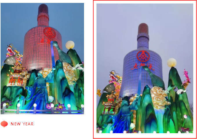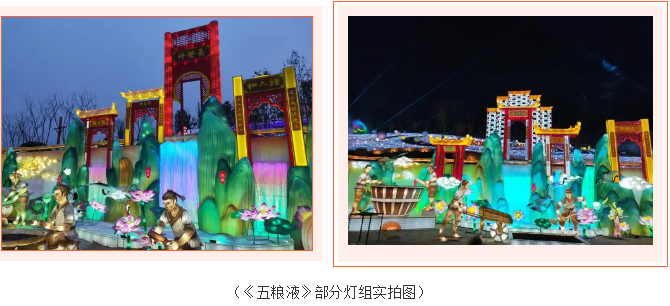 《五糧液》主燈組采用第八代五糧液酒瓶運用自貢彩燈傳統(tǒng)工藝?yán)υ删扌臀寮Z液,輔以仙山、仙境、巨龍騰越氛圍闡釋五糧傳奇,杯酒時光,百年味道。周邊群燈組展示封存在時光中的“活窖池”--利川永、張萬和、劉鼎興、天賜福、聽月樓、全恒昌等八家明代釀酒作坊,歷史悠久的古窖池群講述著傳承幾百年的五糧液釀酒工藝,折射幾千年氤氳酒香的中國酒歷史和酒文化。