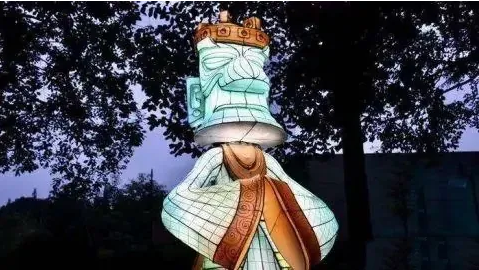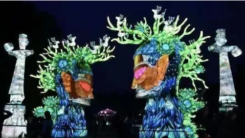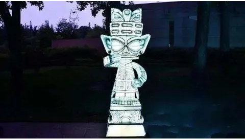 據自貢燈貿集團設計總監(jiān)陳潔介紹,在入口廣場處的燈組以青銅縱目面具為設計原型,作為三星堆“六大國寶”之一的青銅縱目面具,寬1.38米,高0.645米,眼睛呈柱狀向外凸,是館藏中形體最大的青銅面具。本燈組按比例還原青銅縱目面具,燈組高3.2米,寬3.4米。