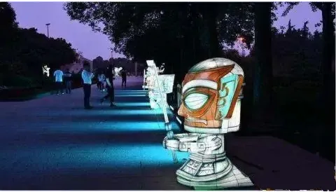 在主干道兩側,各有一排青銅人像燈組,此處燈組復刻了三星堆祈福神官主題盲盒中的青銅人物形象,其中,有大家所熟知的青銅大立人像、雙手合十許愿狀的青銅戴冠縱目面具、平頭與圓頭的“金面使者”等,造型獨特,形象鮮明。融入現代藝術設計卡通Q版形象,加入活潑可愛的人物性格,使文物生動起來。